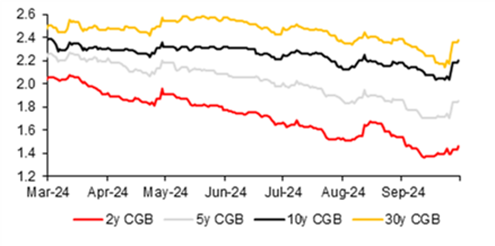 The 10-year JGB yield declined modestly in September, by just 4bps to close at 0.86%. This was in contrast to the bigger declines elsewhere; 12bps in the US and 18bps in Germany. The move was also modest given the ongoing appreciation of the yen and the underperformance of Japanese equities. The guidance from the BoJ is likely helping to support yields given the message remains that further monetary tightening will be required going forward if the economy evolves as the BoJ expects. That view was expressed again at the meeting in September but Governor Ueda did also acknowledge that upside inflation risks had subsided and therefore the BoJ had time to assess the timing of the next move. Given there will be a general election on 27th October, a hike on 31st October is feasible although Governor Ueda’s caution means December is more realistic. Underlying inflation pressures have subsided but the wage data released in September for July was stronger than expected which should feed into better domestic demand conditions and provide support for underlying inflation. We expect 10-year JGB yields to drift higher.