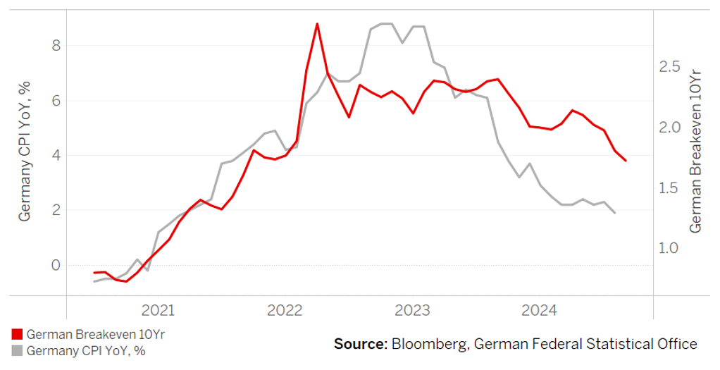 GERMAN BREAKEVEN INFLATION RATE VS. GERMANY CPI YOY,%