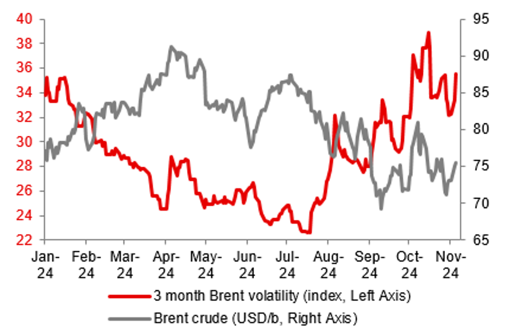 On balance, we believe that risks to our new lower oil price forecasts are skewed further to the downside, given healthy ~6m b/d of OPEC+ spare capacity, potential trade tensions and the possibility that OPEC+ may bring its lost barrels back to market in 2025. Indeed, in the scenario that Chinese oil demand stays flat, the US imposes an across-the-board tariff of 10% on goods imports and/or OPEC+ fully reverses its 2.2m b/d of extra production cuts through November 2025, then we could witness Brent crude testing the low USD60s/b handle. Furthermore, whilst not our base case and we assign a low probability to a moderate recession scenario wherein OPEC+ responds by curbing production further, Brent crude may sink to the USD50s/b range.
