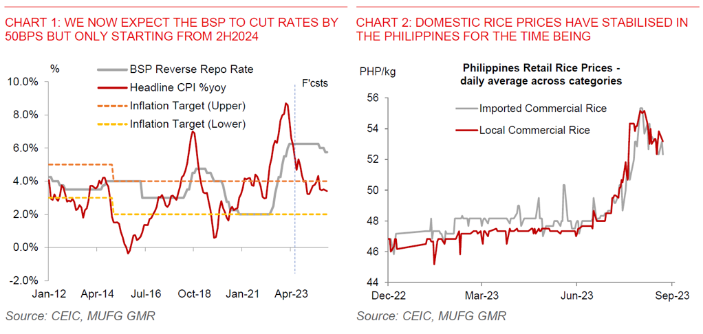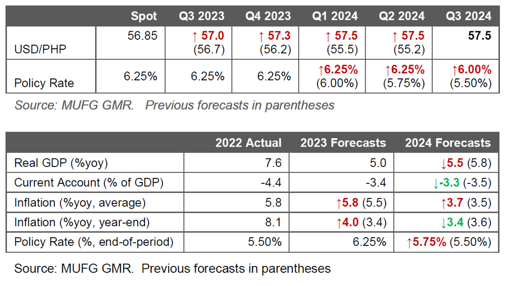 - We now see a shallower and more delayed BSP rate cut cycle than our previous forecast. We continue to see BSP keeping rates on hold at 6.25%, but see the BSP cutting rates by 50bps only from 2H2024 (from 75bps of cuts previously). This partly reflects our higher 2023 and 2024 inflation forecast.