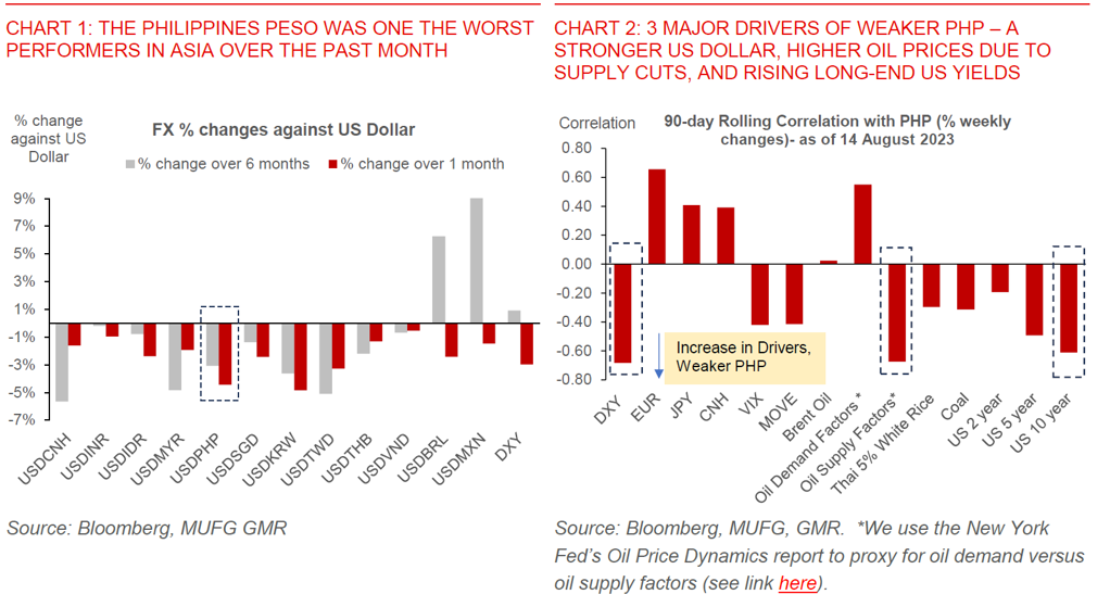 - Our analysis shows PHP weakness can be attributed to three factors. First, the rise in oil prices due to oil supply cuts. Second, the increase in long-end US Treasury yields, and third, the stronger US Dollar.