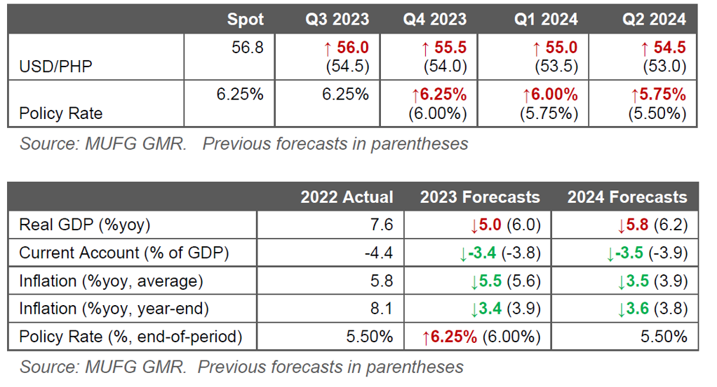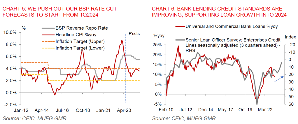 - We now see the BSP cutting rates by 75bps starting from 1Q2024 (from 4Q2023 previously), given uncertainties on global interest rates and commodity prices. We also lower our growth, inflation and current account deficit forecasts.