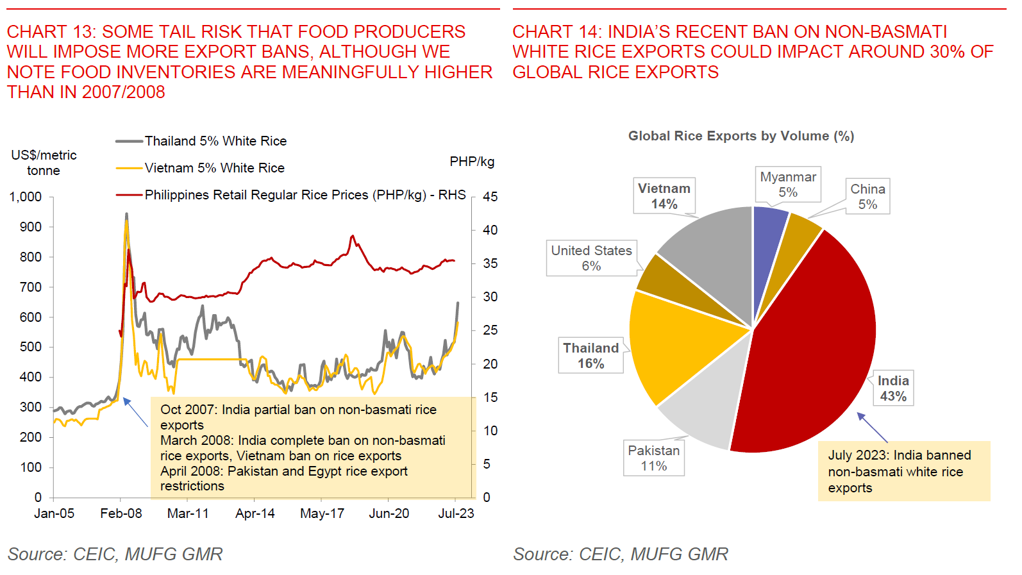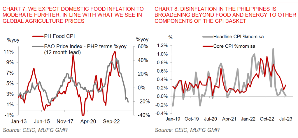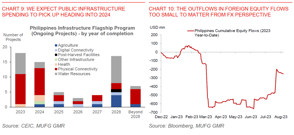 We lower our growth, inflation and current account deficit forecasts, but note that these are also subject to assumptions on oil and food prices: We lower our forecasts for growth, given the sharp downside surprise to the 2Q GDP numbers. More importantly, we think that the second quarter was probably the weakest point, and expect slowing inflation, lagged impact of rates pause, coupled with improvements in the government’s infrastructure spending program to support growth into 2024. Meanwhile, we also think that inflation should come in lower than we initially forecast, and now see CPI ending the year at 3.4% (from 3.9%yoy previously). We already build in some pickup in food prices due to the El Nino impact and recent pickup in global rice prices, but assume that oil prices remain roughly around current levels at US$86/bbl as we head into 2024.