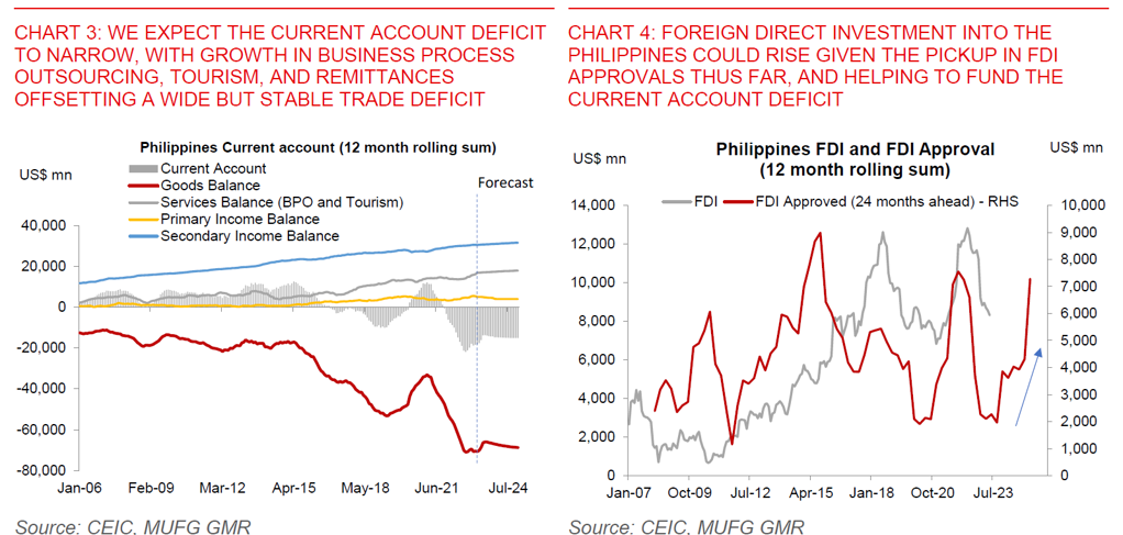 Recent sharp PHP weakness may be overdone. The Philippines’ inflation is coming off faster than we initially expected, the trade deficit is narrowing in part due to softer domestic demand, while FDI is likely to pickup from here: We continue to see USDPHP declining from here for a few key reasons (PHP stronger). First, our expectation is for the US Dollar to weaken over the next 6-12 months as US inflation moderates, the Fed pauses and cuts rates gradually, and China pushes out more stimulus to support its economy. Second, the Philippines’ inflation should fall within the central bank’s inflation target range at a faster pace than we initially expected (by October 2023), notwithstanding uncertainty on global food and energy prices. This means that real rates will turn increasingly positive, which will make Philippines bonds look attractive to foreign investors. Third, the current account deficit remains large but is likely to be narrower at around 3.4% of GDP in 2023 (from 4.4% of GDP in 2022), given the improvements in the trade deficit thus far. Fourth, we see Foreign Direct Investment (FDI) improving given the pickup that we’ve already seen in FDI approvals, which will bring more Dollar inflows and help fund the current account deficit (see Chart 4).