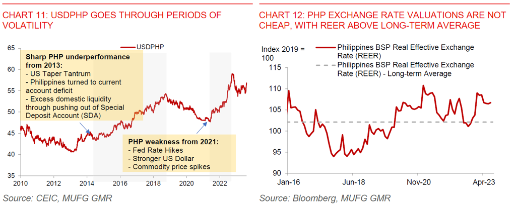 We push out our rate cut forecasts and now see BSP cutting rates by 75bps starting 1Q2024 (from 4Q2023 previously): We think that the central bank under new Governor Eli Remolona should be cautious in cutting rates, especially given the uncertainties on the global front and the Fed’s trajectory. He was recently quoted warning against “sudden reversals” of monetary policy when asked about the possibility of a rate cut. We also think BSP will continue to be in the market to intervene and cap PHP FX volatility, although it will not aggressively target specific levels in USDPHP.