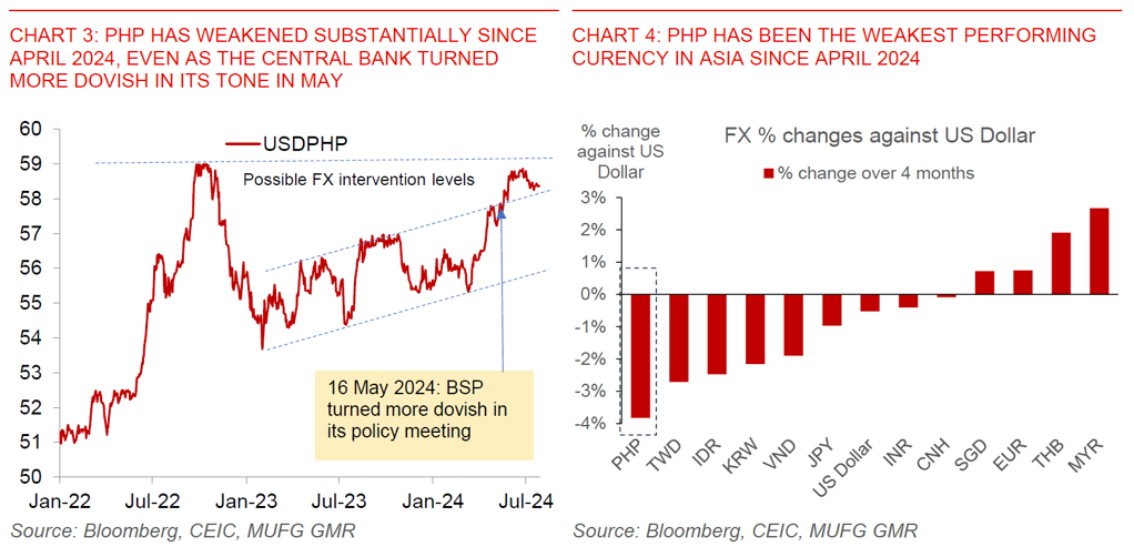 - A key driver of this FX underperformance was likely sparked by a dovish change in tone by the central bank signalling a possible August rate cut, together with a perception that the central bank is intervening less in the FX market. Nonetheless, this is unlikely the full story as the central bank only officially changed its tone to signal a rate cut from the 16 May 2024 policy meeting, and PHP’s underperformance actually started quite a bit before that from April 2024.