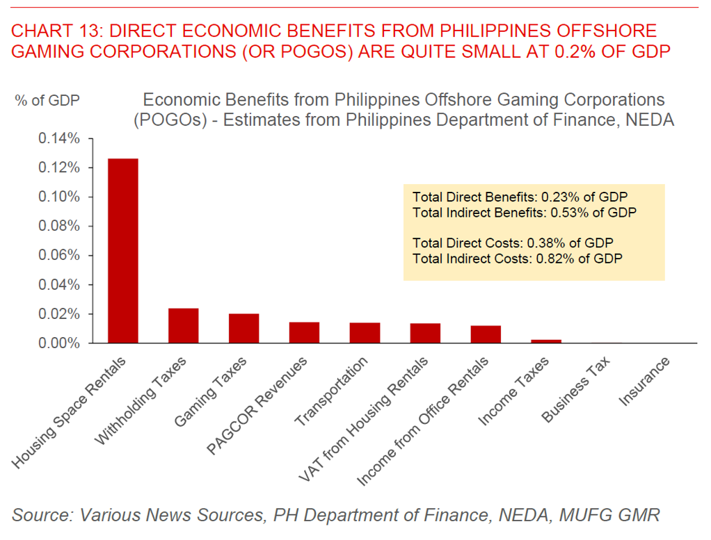 - Nonetheless, we think a sharp PHP rebound like what we saw from 4Q2018 to 2019 is unlikely. For one, PHP is in a different part of the cycle, with the current account deficit likely to widen from here. This is unlike in 4Q2018 when the deficit narrowed meaningfully driven in part from lower government expenditure (see Chart 11). In addition, FX valuations as denoted by the deviation of the Real Effective Exchange Rate (REER) from the long-term average is not cheap in absolute terms, even as it is cheaper than before (see Chart 12). Last but not least, there are also some risks to watch for, including the impact to growth and inflation from Typhoon Carina, coupled with the recent ban on Philippines Offshore Gaming Corporations (POGOs). Official estimates peg the economic benefits from POGOs at 0.2% of GDP (Chart 13).