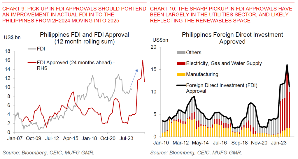 - Second, we expect Foreign Direct Investment (FDI) to pickup more noticeably from 2H2024, reflecting the sharp surge in FDI approvals that we have already seen (Chart 9). This largely reflects rising interest in the utilities sector, which we believe is due to increased investments in the renewables given relaxation of foreign ownership requirements in green energy. Rising actual FDI should help support PHP and fund the wider trade deficit and higher imports needs that we forecast in the Philippines.