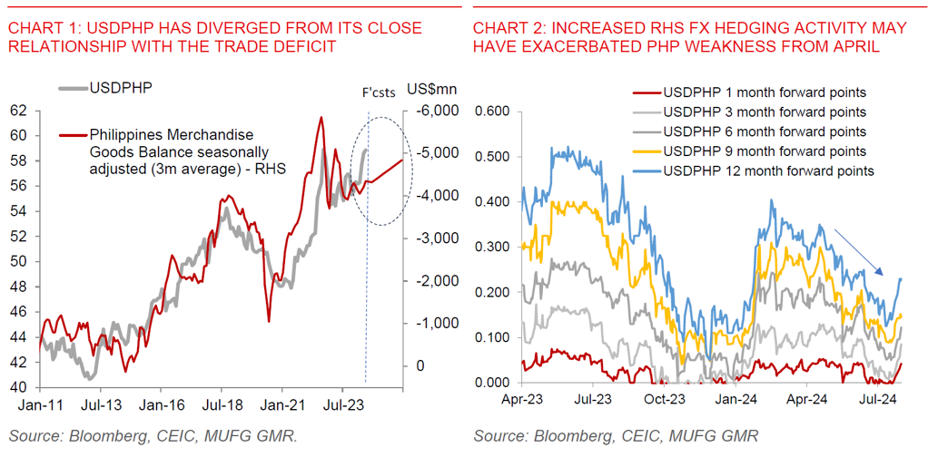 - One element driving our view is that USDPHP has diverged from and overshot its close historical relationship with the trade deficit and the current account (see Chart 1 below). This is true even after factoring in our forecast for a gradually wider trade deficit. What’s driving this divergence may include increased RHS FX hedging activity, coupled with higher resident capital outflows.