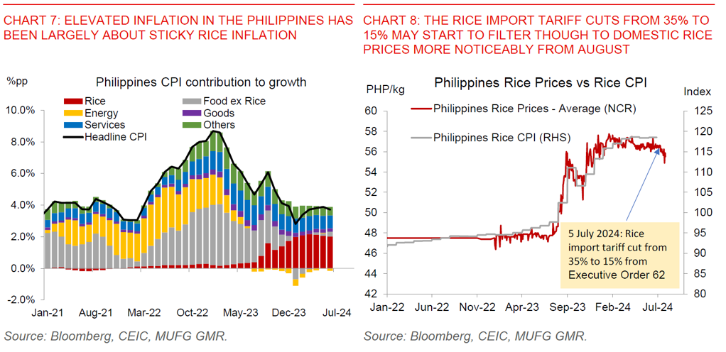 - First, we expect inflation to step down more noticeably from August given the rice import tariff cuts from 35% to 15%. We note that year-on-year headline inflation in the Philippines has been mostly about sticky rice prices thus far (see Chart 7 below). In that regard, the recent rice import tariff cut from 35% to 15% was officially implemented on 5 July from Executive Order 62, and will likely be quite significant given the hefty 9% weight from rice in the Philippines CPI basket. We have seen some tentative signs of a downward trend in rice prices, with average daily rates falling to PHP55.38/kg as of 27 July from PHP56.38/kg on 5 July. We expect the trend of lower rice inflation to be more noticeable from August when the tariff cuts filter through from imports, and should at the very least cap any potential rice price increases moving forward.