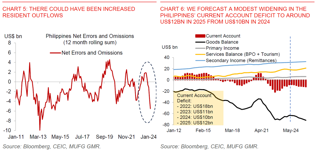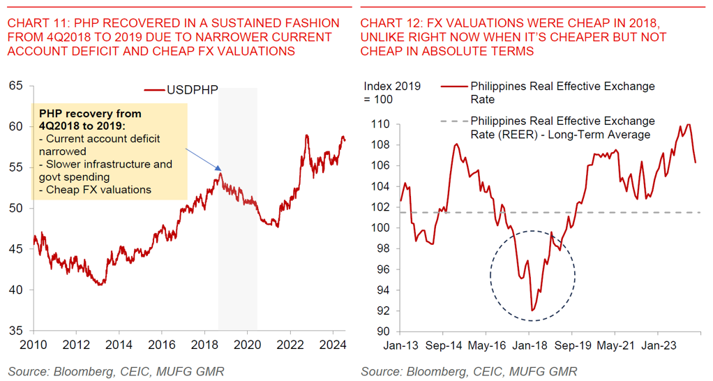 - Overall, with the FX and rates markets much better priced for BSP rate cuts now, we think USD/PHP may gradually converge to its fundaments. Our forecast for the current account and the trade deficit should imply USDPHP closer to the 56-57 levels if that is any guide, before gradually trending higher over the medium-term (Chart 1 and 5). We highlight three factors which could drive a modest move in USD/PHP from divergence to convergence.