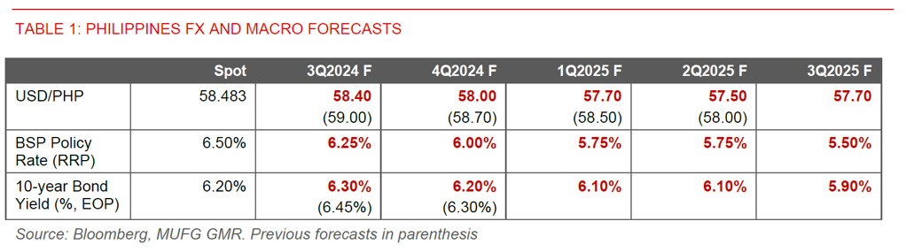 - We lower our USDPHP forecasts to 58.00 for 4Q2024 (from 58.70 previously), and to 57.50 for 2Q2025 (from 58.00 previously). These forecasts imply a modest downward bias for USDPHP at current levels, notwithstanding global drivers such as the upcoming Fed meeting, US Elections and global risk appetite.