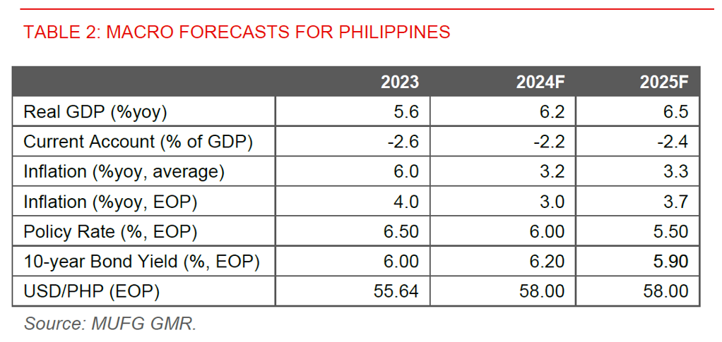 We continue to forecast the BSP to cut rates by 50bps this year, possibly starting in the upcoming August policy meeting, and by another 50bps in 2025. This would bring the BSP’s policy rate to 5.50% by 2025 from 6.50% currently. We see the Philippines’ 10-year bond yields falling below 6% in 2025 with a modest steepening bias.