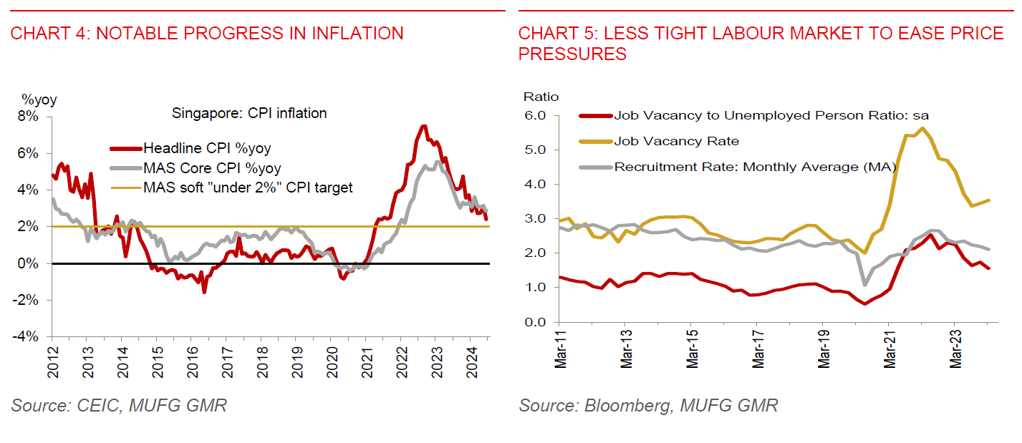 - MAS has also lowered its headline inflation forecast to 2%-3% in 2024, from its previous forecast of 2.5%-3.5%. This has mainly been due to falling private transport prices, driven by the government increasing the supply of Certificate of Entitlement (COE). But, very crucially, the central bank has left its core inflation forecast unchanged at 2.5%-3.5%, possibly due to the impact of several administrative price hikes including the 1ppt GST hike at the start of the year. Policymakers expect MAS core inflation will only step down more discernibly in Q4 before falling further to around 2% in 2025.