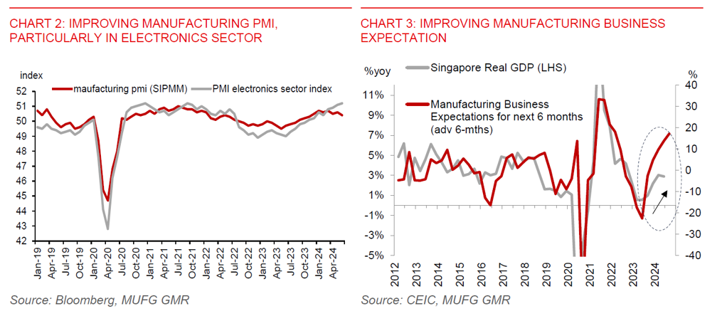- We remain positive about the outlook for Singapore’s economy. There is no change to our 2.4% GDP growth forecast for 2024 vs. 1.1% growth in 2023. Leading indicators suggest sequential growth momentum is set to gather pace. Key growth drivers of Singapore’s economy include improvement in manufacturing and trade-related sectors, continued resilience in services activity, and tourism (Charts 2 and 3).