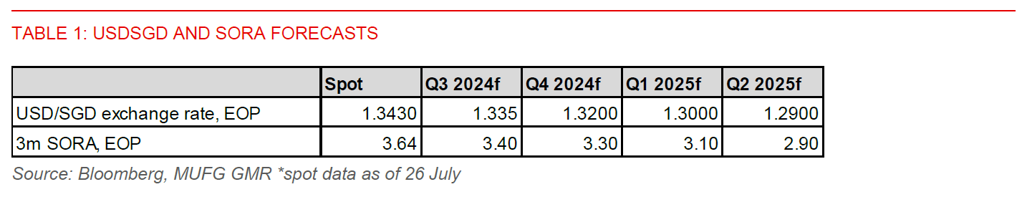 - The MAS left its monetary policy setting unchanged in July, as widely expected. There is no change to the slope, width, or level of the S$NEER policy band. Given our outlook for the policy setting to remain tight this year, we expect the SGD nominal effective exchange rate will continue to move in the upper half of the policy band (Chart 1). We maintain our forecast for SGD to gain modestly to 1.3200 per USD level by end-2024 (Table 1).