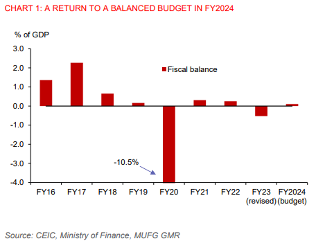 - While the budget provides cost of living support for households, the government is also mindful of the need to maintain fiscal discipline. As such, the government plans to run a balanced budget of 0.1% of GDP surplus in FY2024, which would be a fiscal tightening from the 0.5% deficit in FY2023. The fiscal impulse will only be slightly negative, implying a very modest fiscal drag on growth this year. This, coupled with emerging signs of a better outlook for regional and Singapore’s exports, lead us to maintain our forecast for Singapore’s GDP growth of 2.4% in 2024. Our 2024 growth projection sits at the upper end of the government’s 1%-3% outlook.