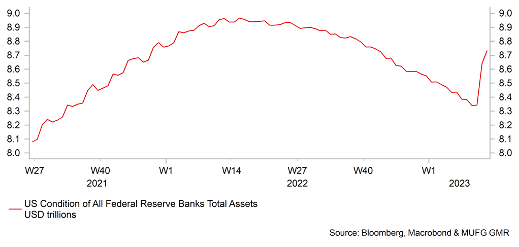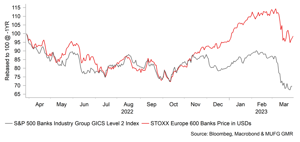 The euro advanced notably in March with the near-collapse of Credit Suisse having limited impact on broader sentiment in Europe. Indeed, while the Euro Stoxx 600 Bank Index closed 14.1% down in March, on a year-to-date basis ended March 3.9% higher. In contrast, the S&P 500 Bank Index is 19.8% lower in March, and 13.8% lower ytd. The near collapse of Credit Suisse was dealt with promptly with the SNB providing strong support for UBS to manage the integration of Credit Suisse through a EUR 100bn liquidity window and a EUR 9bn loss guarantee (after an initial EUR 5bn loss for UBS). Investors ultimately liked the deal and there was an overall recovery in sentiment. However, risks could turn higher again. The euro-zone has 2,400 small/medium-sized banks under national supervision but investors view euro-zone supervision and regulation as more vigorous and hence currently risks are deemed smaller in the euro-zone relative to the US. By contrast, the US has 4,277 small/medium-sized regional banks (FDIC data). The ECB did emphasise in March that it stood ready to take action to ensure ample liquidity if this became needed.