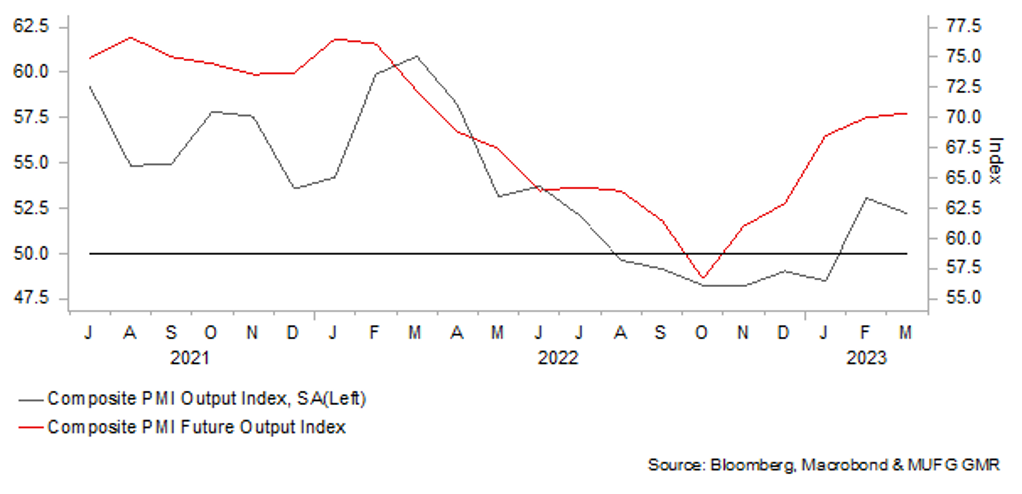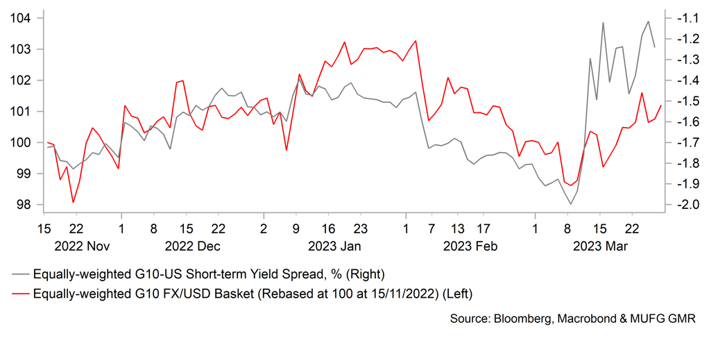 China’s official composite PMI continued to improve in March, suggesting a better set of March data for major macro indicators to be released in mid-April. Against the banking sector risks in DM markets, a relatively better situation in China likely further attracts capital inflows, and CNY will be supported by it subsequently in April. March exports could bring some stress on the currency, as implied by the weaker manufacturing PMI in March.