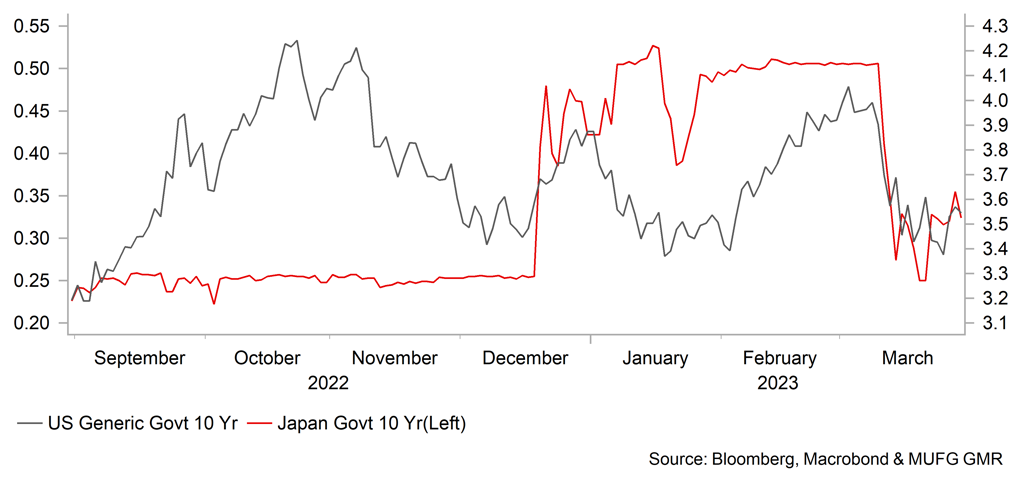 The stronger equity inflows helped strengthen CNY in March, the net foreign institutional investment in China equities increased to USD5,169mn in March from February’s USD1,398mn. We maintain our view of a trend appreciation of CNY against the US dollar for the rest of this year, due to a potential stronger capital inflow and better sentiment towards the China market. China will deliver more attractive performance in both absolute and relative terms in the performances of economic fundamentals and equities. However, due to the recent incidents of SVB and other financial institutions, we expect a potential tighter liquidity condition in DMs compared with before, which could add an extra layer of constraint on economic development, and a subsequently more pessimistic exports outlook for China. Hence we revise USD/CNY to 6.65 (from 6.60) for Q3 end, and revise USD/CNY to 6.55 (from 6.5) for Q4 end.