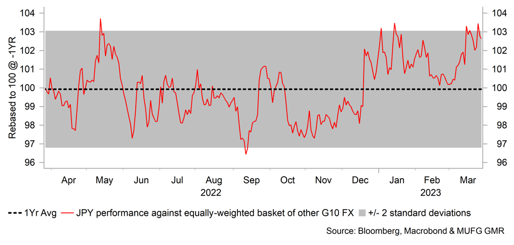 After advancing by 2.7% in February, the US dollar (DXY) renewed the decline that had taken place over the previous four months and fell by 2.3% in March. The banking sector turmoil has fuelled rate cut expectations by the Fed by year-end which was a key catalyst for US dollar weakness. The Fed’s liquidity support for banks could help stem the crisis but there will still likely be an impact on credit flows to the real economy. We have lowered further our USD forecasts over the forecast profile. With the G3 central banks not meeting in April, attention will be much more on the BoJ in April, especially given the meeting on 27th-28th April will be the first for incoming Governor, Kazuo Ueda who takes over from Haruhiko Kuroda on 9th April. We view this as a significant changing of the guard and expect the YCC policy framework engineered by Kuroda to be removed relatively quickly. There have been warnings from the new BoJ leadership over the inevitability of surprises in policy announcements when moving away from a framework like YCC and hence readers should view every BoJ policy meeting as ‘live’ with the potential for a scrapping of YCC. We have maintained our view of an end to YCC in Q2, either at the April or June meetings. We are sceptical of the rebound in USD/JPY in March proving sustainable going forward.