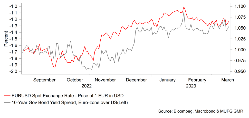The outcome of the increase banking sector turmoil has been a narrowing of the spreads between the euro-zone and the US. The 2yr and 10yr bond spreads are now consistent with EUR/USD trading between 1.1000-1.1500. The banking sector outperformance, the beginnings of the reversal of last year’s energy ToT shock all point to building support for EUR/USD and a move higher through to end-2023