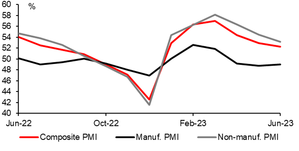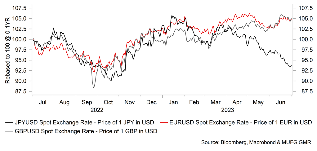The RBA, RBNZ, BOC, ECB and BoJ will also meet in July. All of these central banks could announce unchanged policies apart from the ECB which is highly likely to announce another 25bp hike. The Australia and Canada decisions would likely be viewed more as pauses before further hikes based on market pricing suggesting more hikes are still to come. The BoJ meeting in July is certainly likely to garner more attention than recent meetings. The July meeting will incorporate updated GDP and inflation forecasts which could provide the catalyst for a surprise decision to change policy – most likely through a change in YCC. Governor Ueda in June outlined the path to a change in policy – which would be the BoJ having more confidence in its own forecast for a pick-up in inflation next year after an expected slowdown in the second half of this year. If the updated forecasts showed that it could prompt a surprise change in YCC. As we often state, a change in YCC is highly likely to come as a surprise and with a potential snap election likely delayed until later in the year, a widow has potentially opened up for a policy change.