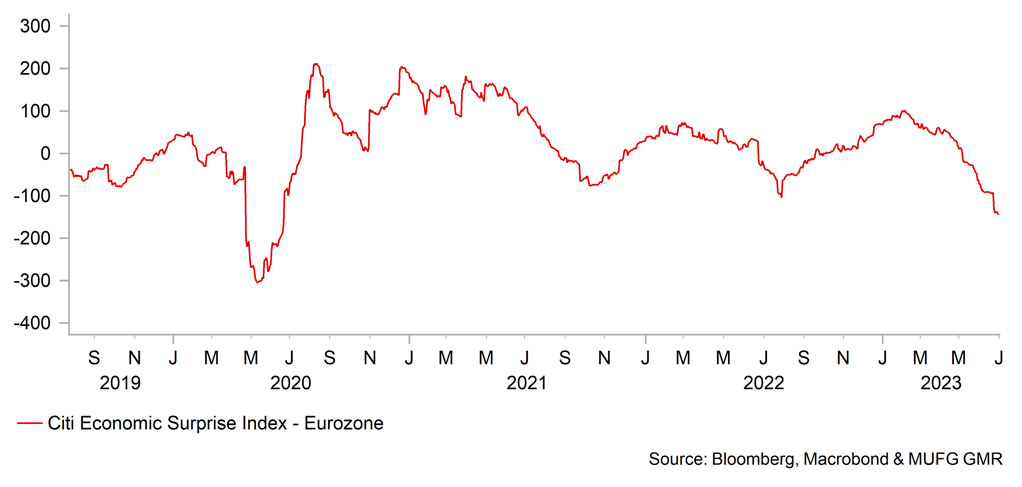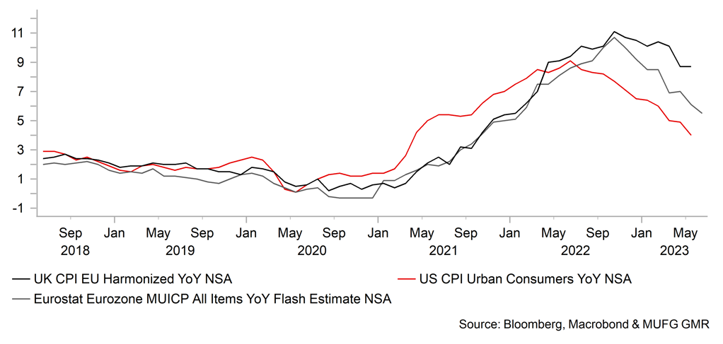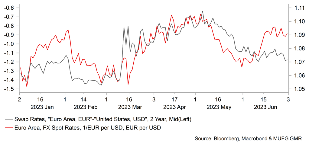 With central banks now much closer to completing tightening cycles, rates and FX are responding more to incoming economic data and central bank guidance in shaping expectations on how much further rate hikes have to go. The ECB was very clear in June that inflation remains too high and that more work needs to be done. ECB President Lagarde speaking in Sintra Portugal stated that there was “not enough proof” to believe core inflation was coming down. It is for this reason we believe the ECB may now hike in July and again in September. Core inflation is set to accelerate in part in June due to the base-effect from service transport prices in Germany but also in general tourism-related inflation is higher this year than last year which may well put upward pressure on core CPI over the summer months. By the September ECB meeting there is a risk that Lagarde will hold the same view that not enough evidence of a slowdown in core CPI is available. Still, it is a close call on a September rate hike given the growth outlook remains fragile and the PMIs released in June point to risks that growth will disappoint ECB expectations.
