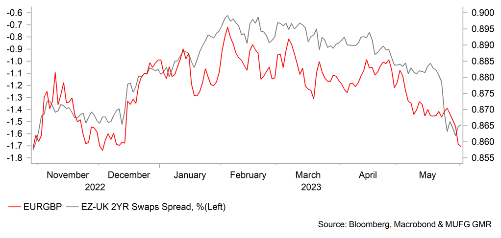 Speculation continues to swirl over whether PM Kishida will call a snap election. His approval ratings over recent months have shown improvement. However, that trend was halted toward the end of May when a scandal involving his son hosting a party at the PM’s official residence undermined his ratings. A Nikkei poll saw his approval rating drop by 5ppt. A decision to hold a snap election over the summer will have to be taken before the current Diet session ends on 21st June. If a snap election is called before then, it would likely take place in July, before the scheduled BoJ meeting on 28th July, which would keep alive the speculation of a change to YCC policy at that meeting. If no announcement is made, the speculation could persist and an election after the summer would still be a possibility that may see any policy changes being pushed further into the future. We still expect YCC changes this year – either a widening of the range or a complete scrapping. With peak rates globally emerging, we see USD/JPY turning lower on a more sustained basis.
