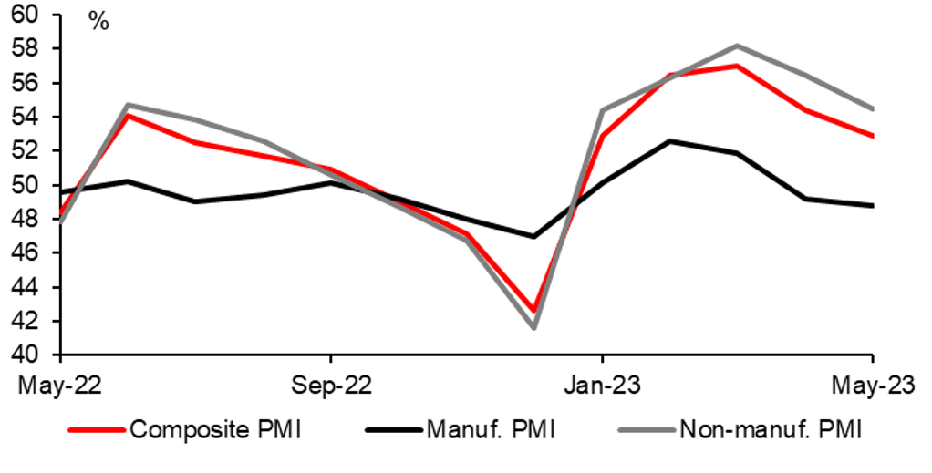 In May the Chinese yuan depreciated by 2.8% against the US dollar to 7.1064. PBOC kept its 1-year MLF rate unchanged at 2.75% on 15th May, and held 1-year and 5-year LPRs unchanged at 3.65% and 4.30% respectively on 22nd May.