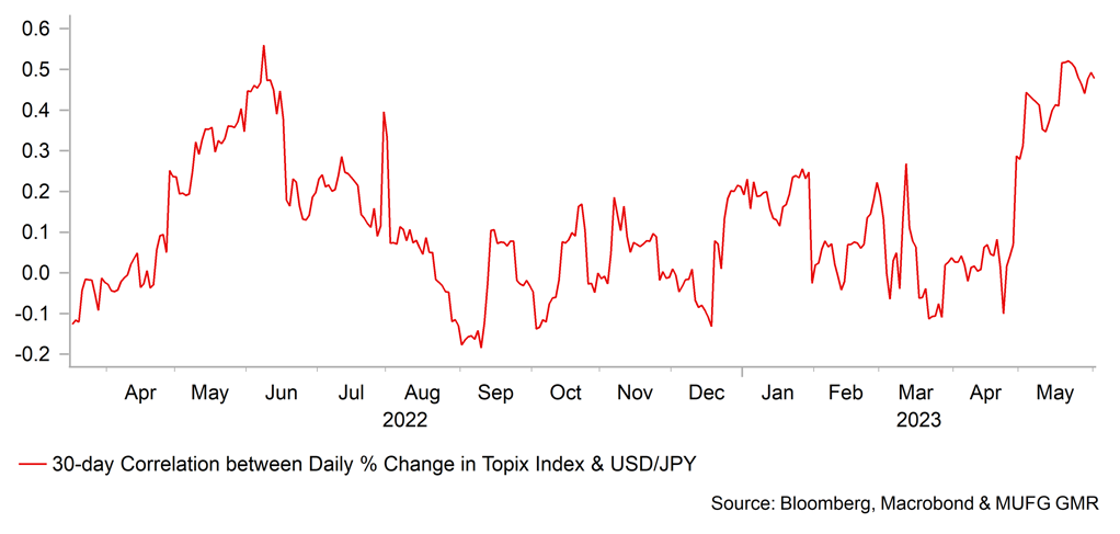 The sense that this time could be different is certainly building in Japan. Foreign investors are buying Japan equities aggressively – buying JPY 7 trillion in just seven weeks. Broader inflation pressures may not slow in H2 as the BoJ expects and the signs of resistance to JPY selling could build further from here. With the Fed set to pause in June, we see limited scope for USD/JPY to move higher from here.