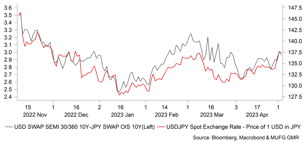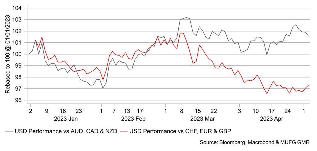 US debt ceiling risks have returned with House Leader Kevin McCarthy pushing through a bill to extend the ceiling but only if government spending cuts are implemented. The Democrats and the White House are refusing to negotiate and the face-off looks like taking us right to the point of which the US Treasury has exhausted its extraordinary measures. US Treasury Secretary Yellen provided an update of x-date citing early June or even the 1st June as the true deadline date before the Treasury would have to commence payment suspensions in order to prioritise coupon payments. President Biden has invited Congressional leaders to the White House on 9th May to discuss resolving the issue. This will become a hugely important issue during the month of May if no resolution is found. We view this event as a US dollar downside risk event versus core G10, like JPY, CHF and possibly EUR. Higher beta G10 FX would underperform due to the increased risk aversion and global growth consequences.