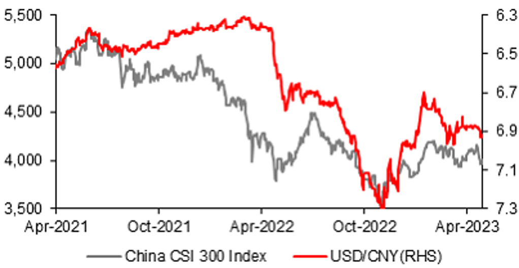 Against the dollar’s near-1% depreciation, the yuan depreciated last month largely on a set of mixed China March data, despite stronger-than-expected 1Q23 GDP growth (Asia Macro Notebook - China: Revising 2023 GDP growth to 5.5%). Although data showed that the Chinese economy was still on a path of expansion in Q1 and March, market concerns increased over the weaker pace of China’s growth momentum in March and the challenges facing the economy including still weak property investment and new floor space. Also the 19.6% unemployment rate of the youth (year 16-24) dampened the prospects of consumption recovery. Benchmark CSI 300 index dropped around 1.5% in April following a mild 0.5% loss in March, foreign investors delivered a net sell of Chinese equities in April.