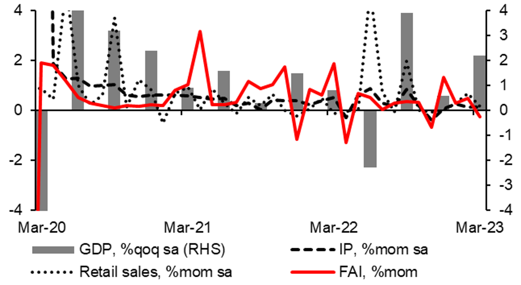 The 10-year German bund yield jumped in April, by just 2bps to close at 2.31%. The move therefore failed to reverse most of the drop in March as the fears over banking sector turmoil receded and the focus shifted back to growth and inflation risks. The general tone of the ECB rhetoric in April was hawkish with more of a focus on wage inflation risks as annual inflation begins to slow. The domestic upside inflation risks mean more rate hikes are coming although the risks globally have begun to recede somewhat. The data from the US points to increased recession risks, EUR continues to advance notably on a TWI basis, reducing imported inflation risks while the optimism over China growth receded with commodity prices turning lower to differing degrees. Brent crude oil has more than fully reversed the bounce following the OPEC+ production cut announcement. We see wage inflation risks receding too and hence see the window for rate hikes by the ECB as closing over the summer. 50-75bps of tightening seems plausible from here but with inflation receding and global growth remaining mixed, we believe the 10-year yield is currently peaking out before turning lower through the rest of the year.