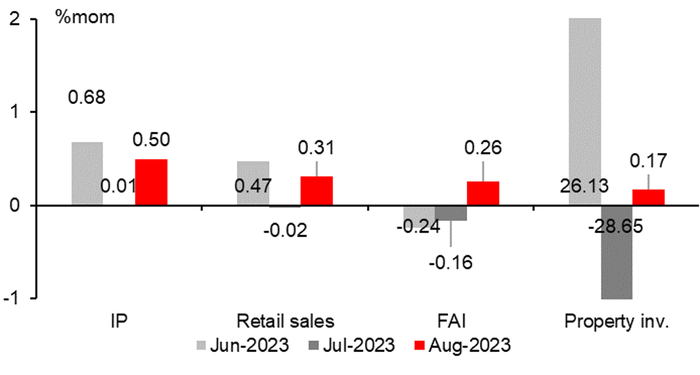 While sequential growth of China’s key data including IP, retail sales, FAI and property investment were positive in August, year-on-year growth of these indicators remained mixed. While year-over-year growth of IP and retail sales accelerated and surprised the market to the upside, growth of YTD FAI edged lower, and the year-over-year contraction of YTD property investment became more severe in August.