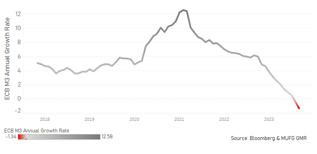 The euro is approaching lows of the year just below the 1.0500-level and the depreciation in September looks set to extend over the coming months – we see a window of dollar strength persisting over the coming months before the data turns weaker in the US and the EUR/USD rate can partially retrace declines over recent months. The macro-economic backdrop in the euro-zone is also unfavourable with Germany continuing to suffer lost competitiveness related to high energy costs and China subsidised exports. The German manufacturing PMI increased marginally in September to 39.8 (from 39.1) but has only been at these levels or worse during the pandemic and the GFC. The German levels stand out and are roughly 5ppts lower than other key countries like France, Italy and Spain. The transmission of monetary tightening is also likely to weigh on growth in the euro-zone too, just like the US, and M3 money supply data underlined the tightening of financial conditions. M3 money supply contracted by 1.3% YoY in August from -0.4% in July. The swing in the YoY rate over 12mths was -7.5ppts, approaching the scale of change in annual M3 during the GFC, which at its worst point was 8.3ppts.