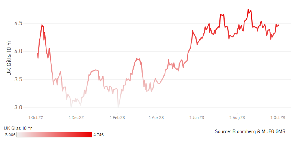 The 10-year JGB yield increased further in August, by 12bps to close at 0.77% and this move was met with an unscheduled JGB buying operation on 29th September in the 5-to-10-year sector. However, the total of the operation was just JPY 300bn which highlighted the limits to curtailing JGB yields when the yen is at extreme weak levels that Tokyo want to curtail. We expect further subtle hints from BoJ officials that suggest Japan is moving toward price stability that will allow the BoJ the opportunity to end NIRP and YCC. We assumed prior that YCC would end before NIRP but if wage data remains firm and indeed if there is evidence of a pick-up then the BoJ could decide to end NIRP sooner, say in January. We remain unconvinced that Japan is shifting to being able to grow with an inflation rate of 2.0%. However, there is a window that exists now where conditions are more consistent with that and if recessionary conditions emerge in the US in 2024 (our view), removing the current policy stance could be done without any notable tightening of financial conditions. We see JGB yields moving slowly further higher as policy is adjusted.
