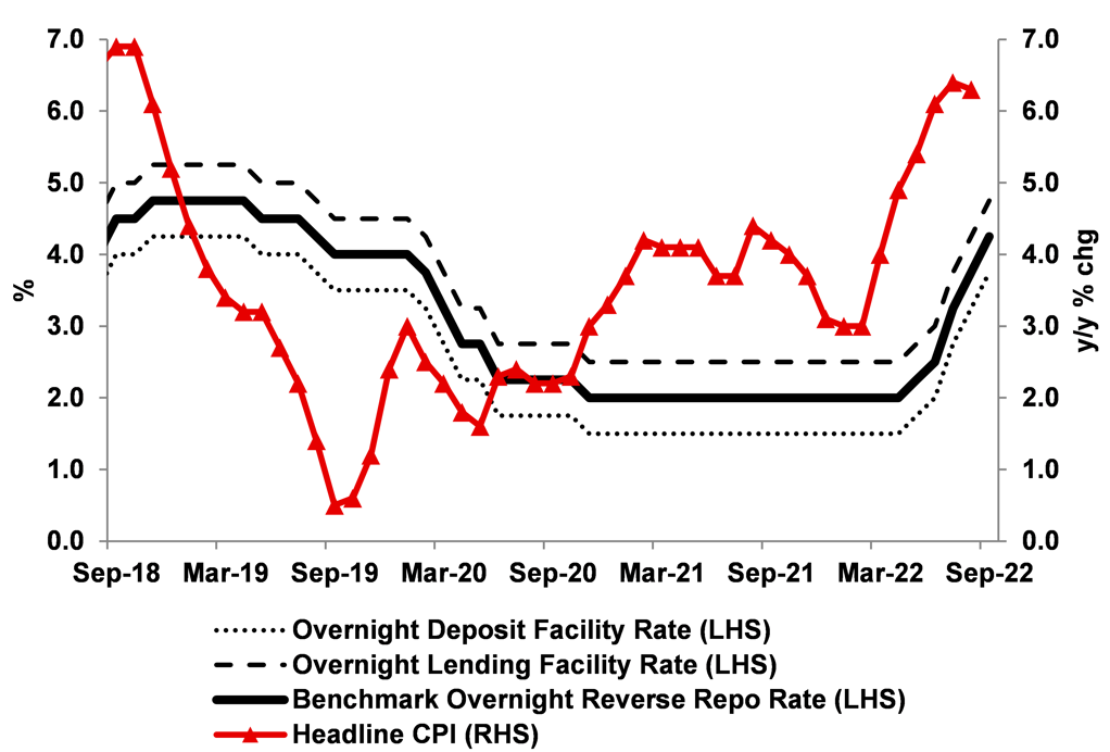 The BSP raised the benchmark overnight reverse repo rate by an outsized 50bps for the second time in a row to 4.25% at its policy meeting today. This outcome is within our expectations as well as 19 out of 25 analysts polled by Bloomberg. This brings the total number of rate hikes to 225bps so far this year, which is the most aggressive pace of tightening within AXJ.