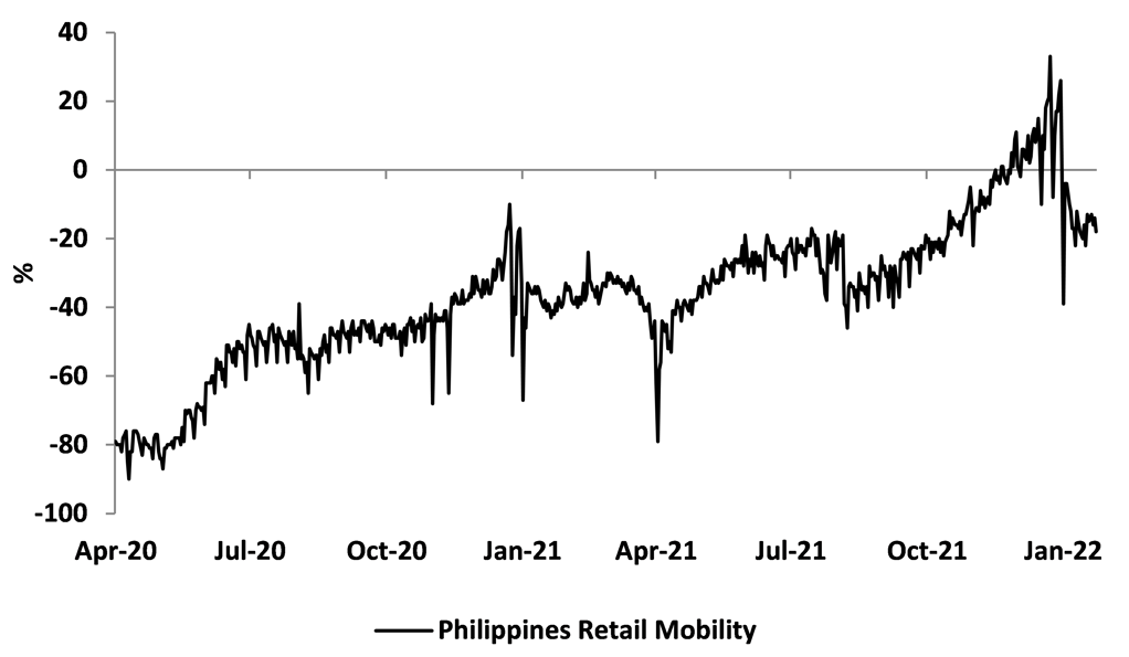 The surge in the Omicron variant and stricter mobility measures pose downside risks to growth in the near term. But we anticipate this to be temporary as new infections seemed to have peaked and the authorities signalled possible relaxations in mobility measures in the coming weeks. Retail mobility seemed to have hit a trough on 16 January based on data provided by Google. As such, on a sequential basis, we are only expecting a modest deceleration in real GDP growth in Q1 from Q4’s 3.1% q/q s.a. Real GDP growth in Q1 is also expected to be propped up by election pump-priming, but that is expected to fade in Q2 when the 45-day pre-election spending ban kicks in. Real GDP growth is expected to be stronger in 2H22, barring emergences of new COVID-19 variants and tightening of mobility restrictions. This is premised on a pick-up in government spending as the new administration is likely to keep outgoing President Duterte’s ‘Build, Build, Build’ infrastructure programme. The Philippine economy is expected to get back to pre-pandemic levels by then. This is one of the reasons why it would be more appropriate for the BSP to hike in 2H22, likely by a magnitude of 50bps which would take the benchmark overnight reverse repo rate to 2.50% by year end.