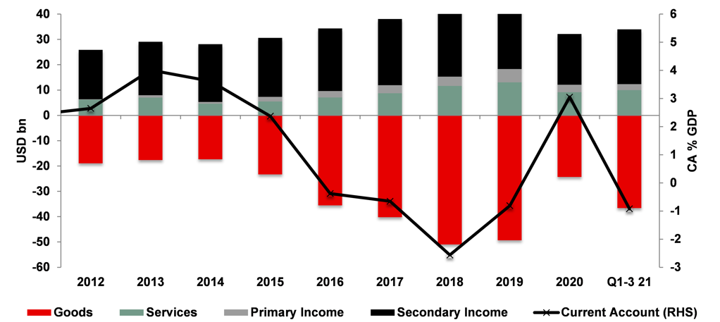 The Philippines’ real GDP growth rose by 5.6% in 2021, higher than Bloomberg consensus at 5.1% and 2020’s -9.6% slump. Stronger private consumption has been the key driver of this recovery and is likely to remain so this year. The current Omicron variant surge and decline in retail mobility pose downside risks to growth in the near term, but we think the impact is likely to be temporary with the rate of infections likely to have peaked. Even with a stronger-than-expected real GDP growth rate in Q4, we think it will be premature for the BSP the hike in 1H22 as the economy is still below pre-pandemic levels and a negative output gap persists. We still have the BSP starting policy tightening in 2H22 as our base case scenario but acknowledge risks of an earlier start should policy tightening by the Fed be more aggressive than anticipated. A consumption-led economic recovery is expected to result in larger trade and current account deficits this year. This, alongside near term USD strength, is expected to keep the PHP under pressure this year. The 52.00 mark is now a key level to watch for USD/PHP.