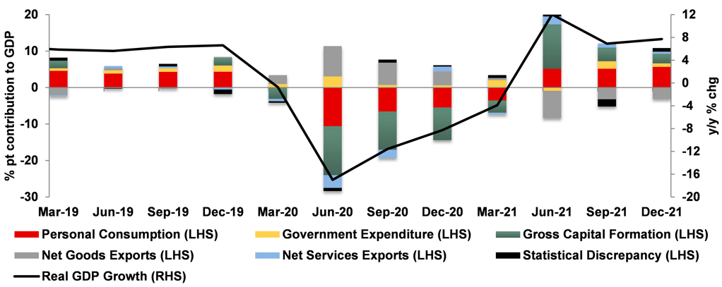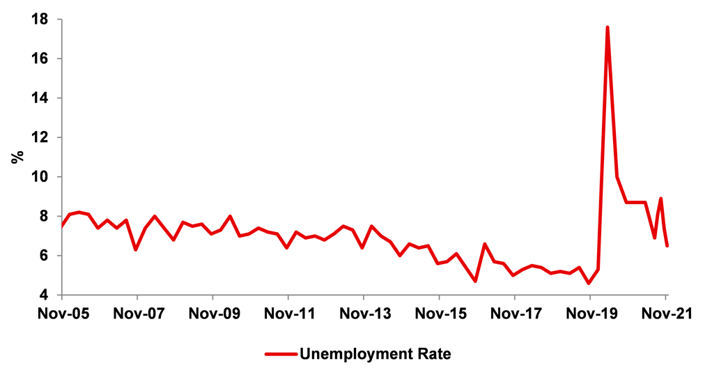 Real GDP growth in Q4 rose by 7.7 % y/y, exceeding Bloomberg consensus at 6.3% y/y and Q3’s revised 6.9% y/y. Private consumption and investments were the key drivers of the economy. In Q4, private consumption added 5.7 percentage points to real GDP growth from 5.2 percentage points in Q3, and gross fixed capital formation added 2.6 percentage points to real GDP growth in Q4 from 3.8 percentage points in Q3. As expected, net goods exports was the main drag on growth and shaved off 3.1 percentage points from real GDP growth in Q4 after a 3.2 percentage point reduction in Q3. Note though that these growth rates come after a very low base in 2020 – real GDP growth averaged -6.0% in 2H20. This means that real GDP growth is still below its pre-pandemic peak and a negative output gap remains. As such, the BSP is likely to maintain an accommodative monetary policy stance in 1H22 with the benchmark overnight reverse repo rate to be kept at 2.00%. Our view is also premised on BSP Governor Diokno’s recent comments that a rate hike in 1H22 is unlikely as the central bank wishes to adopt a wait-and-see approach before starting to tighten monetary policy. The BSP would like to see four to six quarters of steady growth and an unemployment rate of about 5% before it would consider hiking rates. Latest available data show the unemployment rate moderated to 6.5% in November, which is the lowest since January 2020.