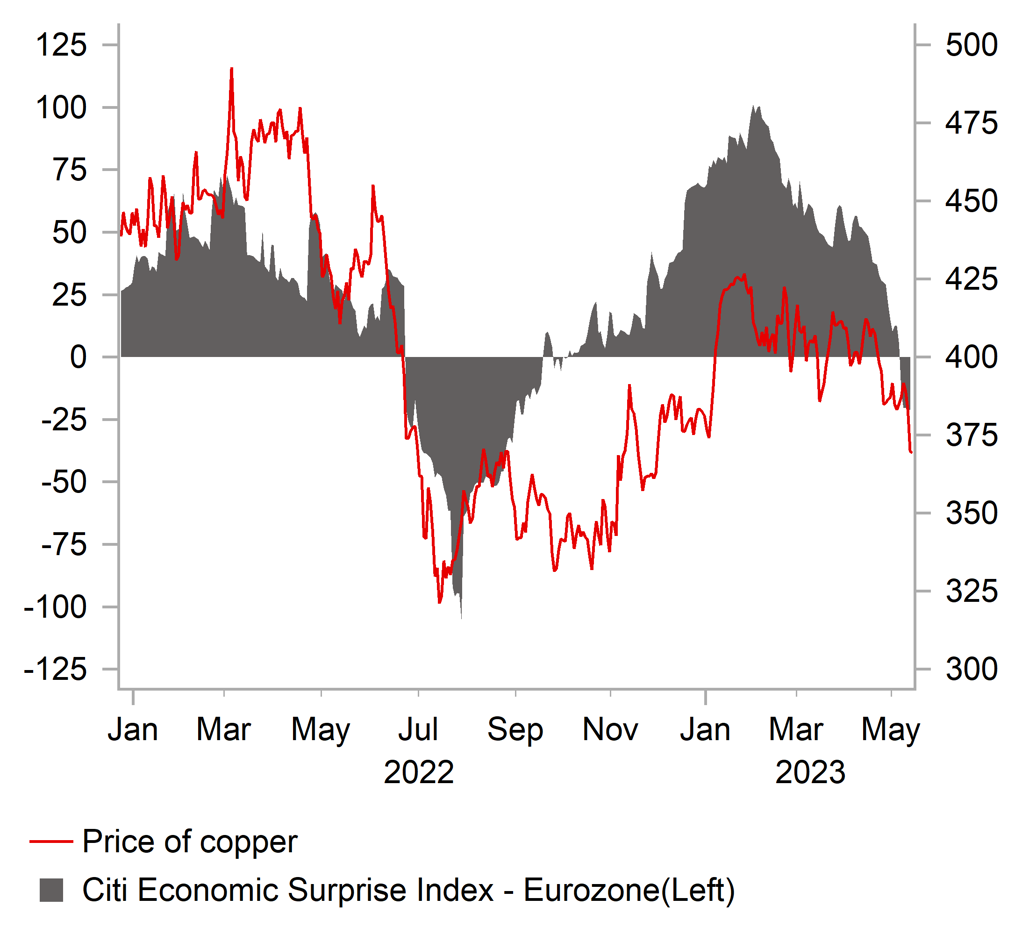 The US dollar has strengthened against all other G10 currencies over the past week although gains have been relatively modest. The USD has been more resilient to the drop in US yields. It could partly reflect that expectations for a dovish shift in Fed policy are better priced in now, and that evidence of a sharper slowdown in US growth and/or inflation will be required to encourage expectations for deeper rate cuts. Furthermore, market participants are starting to question more the growth outlook outside of the US which is helping to support the USD. The ongoing decline in commodity prices casts doubt on the strength of the pick-up in demand from China ahead of the release next week of the latest activity data for April. We will also look into potential implications for the USD from the debt ceiling stand-off