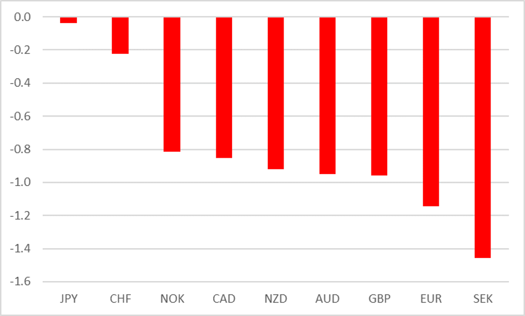 This week saw greater divergence between spot and our fair value model. Monitoring the relationship between USD/JPY fundamentals and spot, our model calculates a 4.60% overvaluation of spot. Current mis-valuation lies between the upper quartile and maximum of the typical distribution.