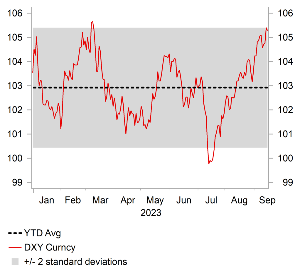 It has been a volatile week for the USD. After correcting lower at the start of the week in response to pushback against domestic currency weakness from policymakers in China and Japan. The USD quickly regained upward momentum with the dollar index on course to close higher for the ninth consecutive week and threatening to break out of the top of the year to date range. The week ahead will be dominated by central bank updates from the Fed, BoE, and BoJ. We expect the BoE to deliver another rate hike but provide less hawkish guidance over the need for further hikes like the ECB that could weigh on the GBP. In contrast we expect the Fed and BoJ to leave policy unchanged next week. The JPY is likely to weaken further if Governor Ueda does not push back as strongly by talking up the possibility of an earlier hike. The main downside risk for the USD would be if the Fed scraps plans for one more hike. But any correction should again prove short-lived.