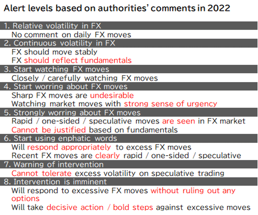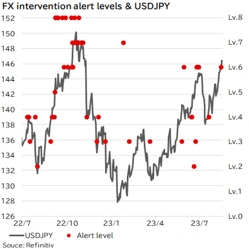 A hawkish speech by Powell could create problems for Tokyo. The scale of the move higher in USD/JPY since the BoJ policy meeting in July when YCC was tweaked is certainly on a scale consistent with the moves ahead of intervention in September and October last year. But our sense currently is that the rhetoric from Tokyo has yet to reach the fevered levels that usually precedes actual intervention. Our Tokyo colleagues have translated from Japanese language prior comments when intervention took place last year and created an “Alert Scale” to provide a gauge for where we are now. We estimate based on an “Alert Scale” of 1-8, to be currently at about 6 suggesting there is a bit more to go before we reach an equivalent level of urgency prior to actual intervention.