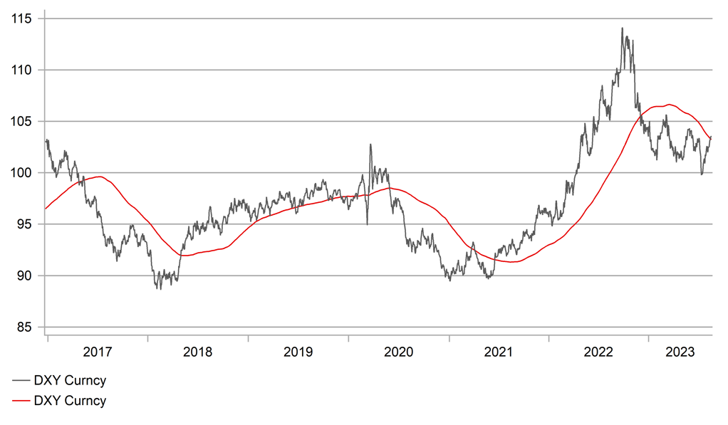 Last week the dollar advanced versus all G10 currencies and this week it has been nearly a repeat of that with only GBP outperforming very modestly. That outperformance reflects the strong wage data in the UK and inflation data that fell less than expected. The 2yr Gilt yield has jumped 19bps this week – the US equivalent is up 2bps. While the Fed and the ECB may be in a position to pause and probably end their tightening cycles the BoE still has some work to do. But notwithstanding the resilience of GBP this week, we still see scope for the dollar to strengthen further. The speed of USD strength has slowed today which is in part due to the evidence of greater opposition in China to USD/CNY gains. The PBoC fixing today was set at the widest divergence from the market estimated level since that estimate started being published by Bloomberg in 2018. Reports of increased USD selling by China’s state banks also helped contain the USD/CNY move higher. But given the heightened uncertainty over China’s property sector problems and the lack of any clear policy strategy, we suspect further increases in USD/CNY is likely. The PBoC cut rates again and the 2yr spread vs the US is approaching 300bps, the widest since July 2007 when USD/CNY was trading at around 8.0000. DXY this week broke above its 200-day moving average and a close above 103.23 today would be the third consecutive close above the key technical level and provides a positive technical backdrop for the dollar as well.