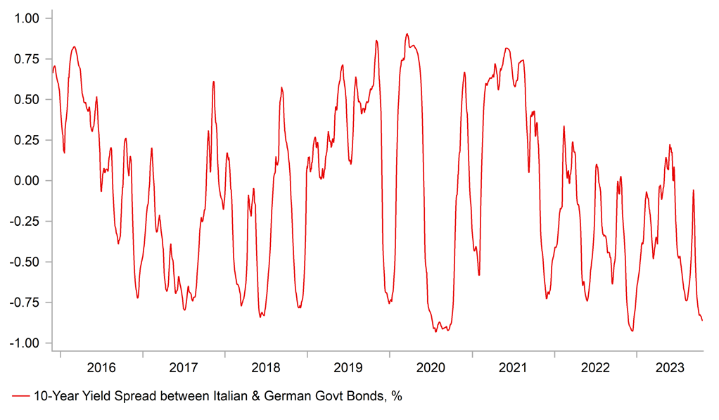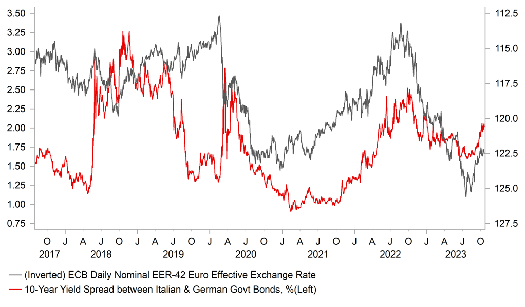What is perhaps more plausible is a shift in guidance on the commitment to continue reinvesting all maturing securities under the PEPP program through to the end of 2024. We don’t think the ECB will alter its formal guidance next week but there is certainly a much higher risk that in the Q&A President Lagarde acknowledges for the first time that a discussion in regard to PEPP plans in 2024 took place at the meeting. That mere acknowledgement would raise considerably expectations of a change in PEPP policy to a tiered slowdown in PEPP reinvestments possibly from the start of next year. However, given the rout taking place at the long-end of bond markets it would be a risky strategy and it’s plausible this acknowledgement is left until December. If Lagarde does confirm a discussion took place we would likely see a clear reaction, in particular in the BTP market. The spread over Bunds on the 10yr broke above 200bps this month to reach levels not seen since December. The EUR 24bn tax cut and fiscal deficit slippage confirmed by Rome is reinforcing upward pressure. Perhaps this could even incentivise the ECB to signal a change. We would class BTP market developments as a key downside risk for EUR at present. A three-month rolling correlation of the BTP/Bund spread and EER-41 EUR is currently at -0.85.