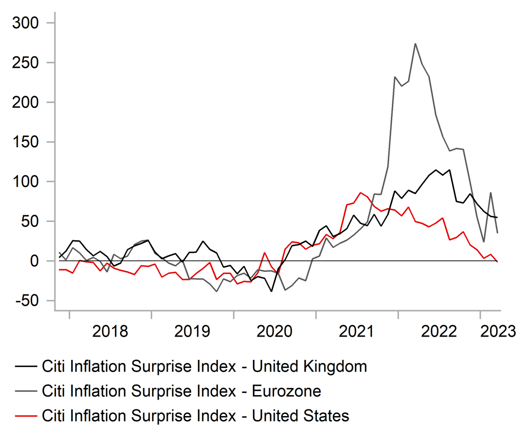 The US dollar has staged a modest rebound over the past week supported by the scaling back of more dovish Fed policy expectations. One final 25bps hike has been fully priced into the current tightening cycle. However, we doubt that there is much scope for US rates to keep moving higher from here with US growth and inflation surprising to the downside. It stands in contrast to further upside surprises for growth and inflation outside of the US. The developments make us more confident that the Fed will pause their hiking cycle ahead of the BoE and ECB. The BoJ will hold the first policy meeting under new Governor Ueda in the week ahead. Ahead of the meeting, the BoJ has dampened expectations for a shift in YCC policy settings that has contributed toward JPY underperformance so far this month. Political developments in Japan are expected to garner more market attention in the week ahead and have the potential to alter BoJ policy expectations.