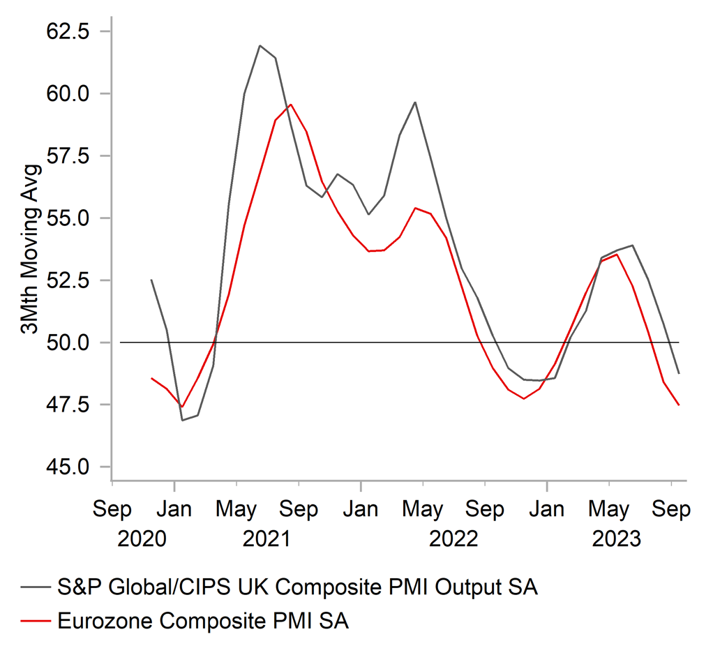 zone composite PMI survey reading improved slightly by 0.4 point to 47.1 in September driven by improving sentiment in the German service sector (49.8) which offset more acute weakness in the French services sector (43.9). For the quarter as a whole, the euro-zone composite PMI has averaged 47.5 in Q3 which is a marked step down from 52.3 in Q2 and highlights the risk of another quarter of negative growth. A similar picture is evident in the UK where the composite PMI fell to 46.8 in September and averaged 48.7 in Q3 down from 53.9 in Q2. The European PMI surveys are now at levels which historically are more consistent with the BoE and ECB cutting rates. It supports our view that the BoE (click here) and ECB (click here) have now reached the end of their rate hike cycles. The combination of weakening cyclical momentum and the peaking rate hike cycles, leaves EUR and GBP vulnerable to further weakness in the near-term if rate cut speculation continues to build heading into next year. The euro-zone rate market is currently pricing in around -60bps of ECB cuts by the end of next year and UK rate market around -39bps of cuts.
