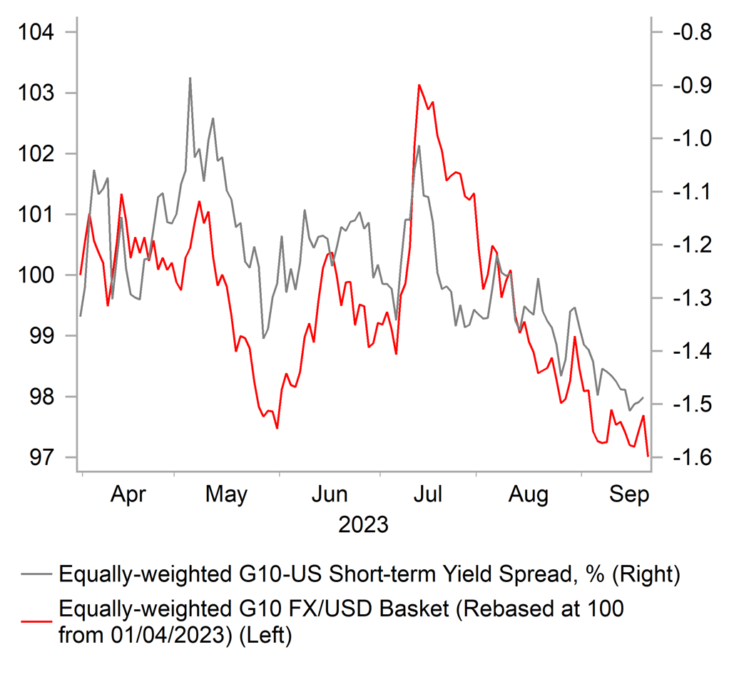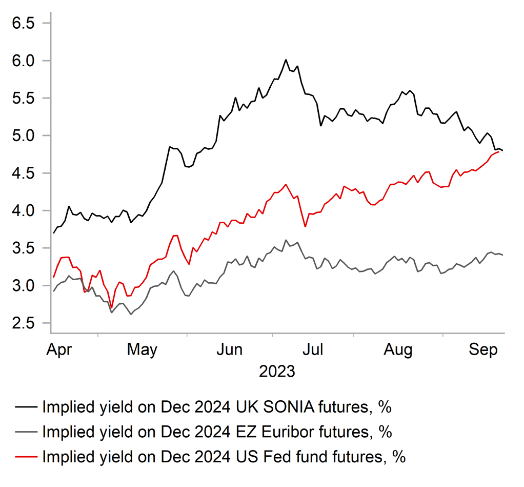 The Fed’s updated projections revealed a more moderate slowdown for the US economy when GDP is expected to slow to 1.5% in 2024 down from 2.1% this year. The more moderate growth slowdown means that less spare capacity is now expected to open up resulting in the unemployment rate rising to a lower peak of 4.1% and making the Fed more wary about lowering rates next year. FOMC participants median projection for the policy rate at the end of next year has been raised to signal only 50bps of cuts compared to 100bps in the June projections. The US rate market has bought into the Fed’s higher longer view this week even though it appears almost too good to be true. The unemployment rate has already risen by 0.4ppts from the low in January and over the next couple of years is expected to rise by only a further 0.3ppt. We still expect the Fed to deliver larger rate cuts next year than planned on the back of inflation falling more quickly and weaker growth, although the recent resilience of the US economy is currently challenging that view. The near-term outlook for US growth also faces challenges from i) the restart of student loan repayments with the 1st October deadline that is fast approaching, ii) the risk of another government shutdown from 1st October if Congress fails to pass legislation next week to renew funding, and iii) the United Auto Workers strike that could be a noticeable drag on Q4 GDP and negatively impact the NFP report for October. Those downside risks to growth support our outlook for the Fed to leave rates on hold rather than following through on plans to deliver one last hike later this year.